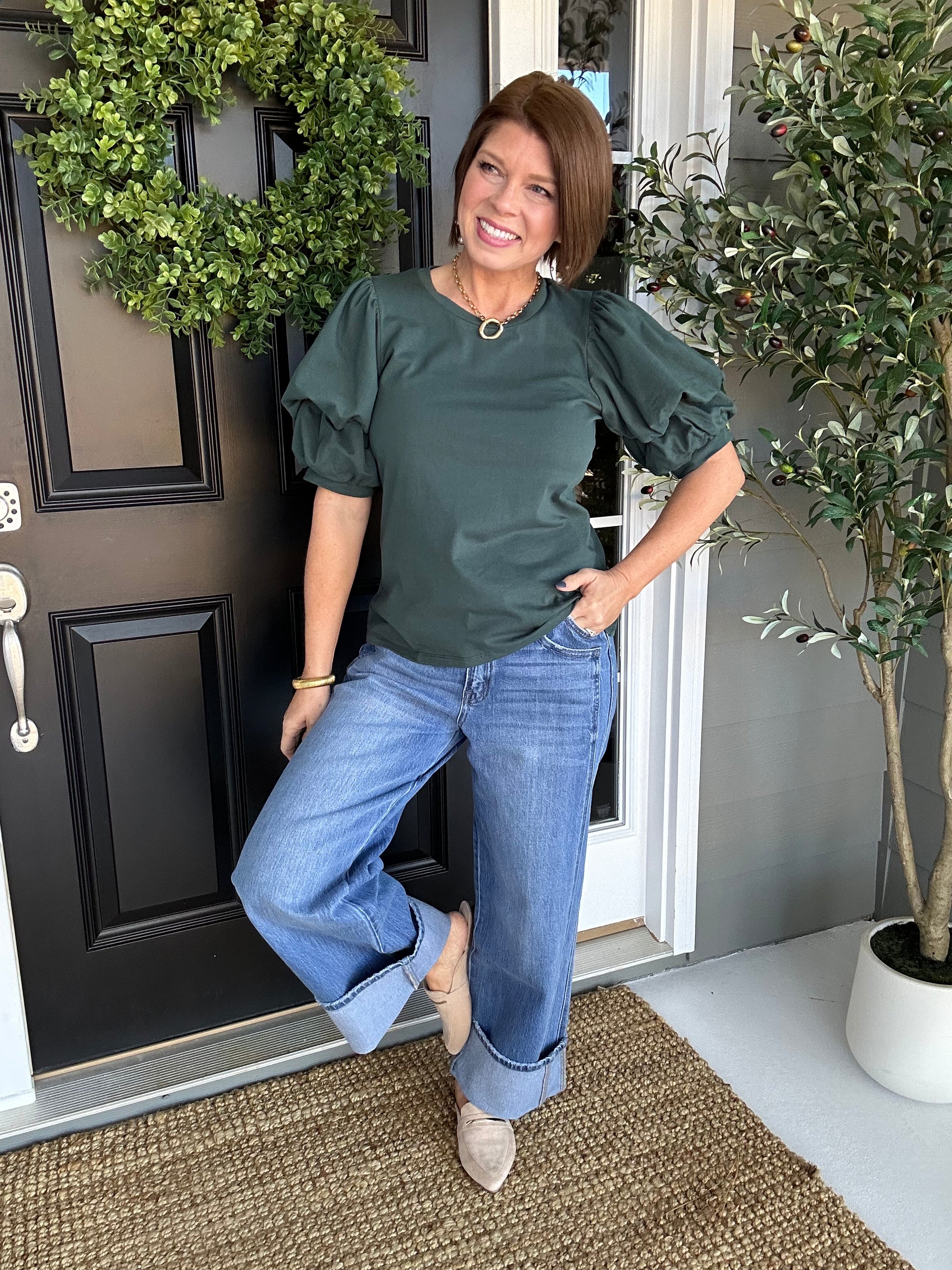 Solid bubble sleeve top featuring elastic at arm. Unlined. Knit. Non-sheer. Lightweight.