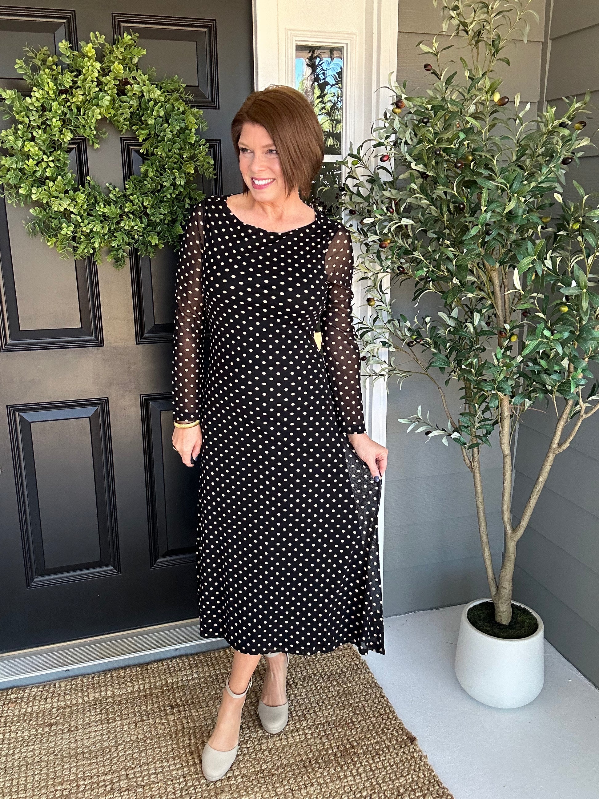 Elevate your wardrobe with this charming Bambi Dot Midi dress, featuring a flattering scoop back with adjustable tie detail. The semi-sheer fabric is beautifully lined for comfort and confidence, while delicate light mocha polka dots dance across a classic black base. A convenient side zipper ensures effortless dressing. Perfect for the holidays, church, date nights, brunch, or any occasion calling for understated elegance with a playful twist.Â