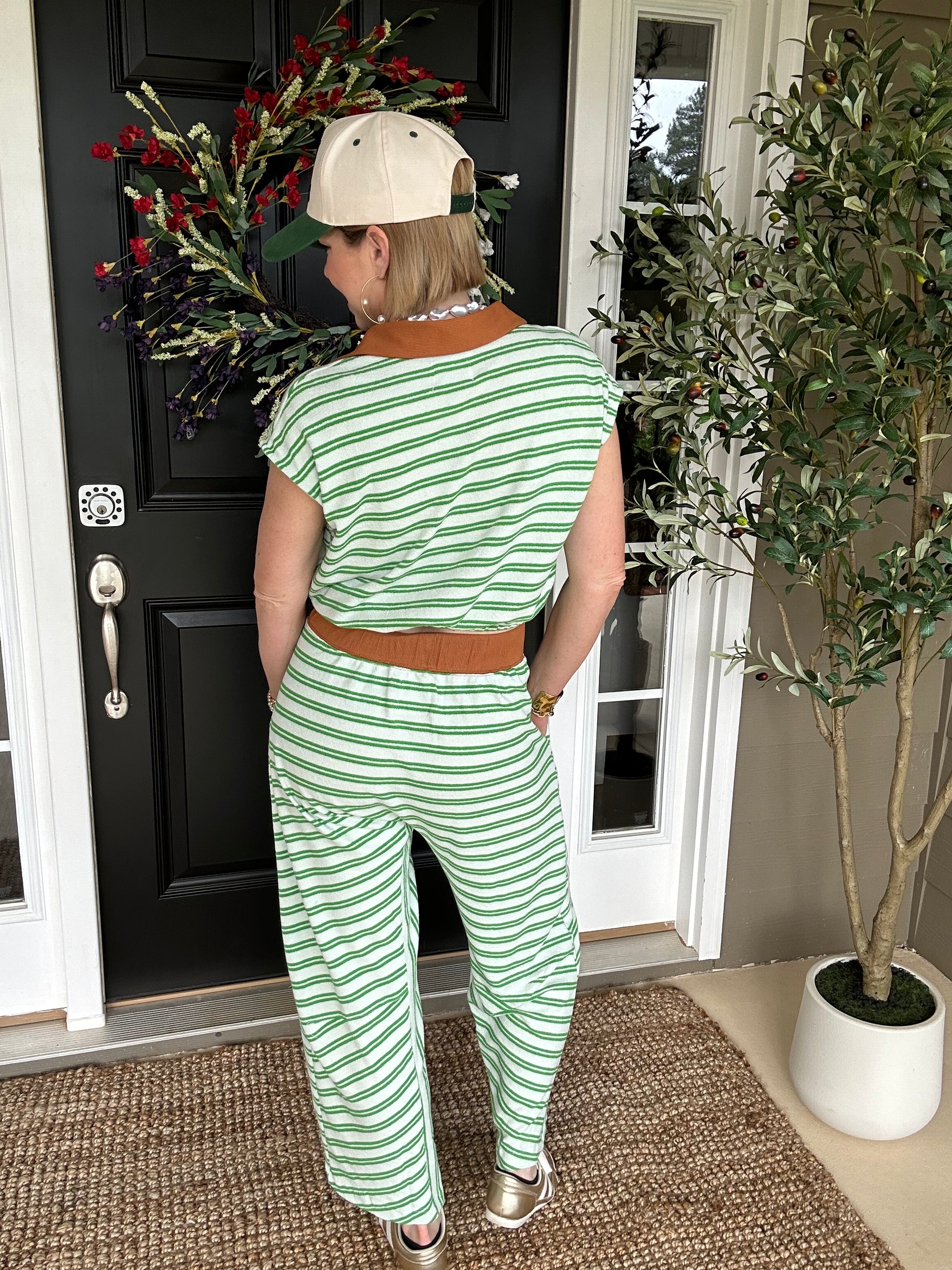 Women's 2 piece knit striped set. Crop Top: Short cap sleeves with Collard, V-neckline and elasticized hem. Pants: High Waisted Barrel style with contrast waist band and side pockets.
