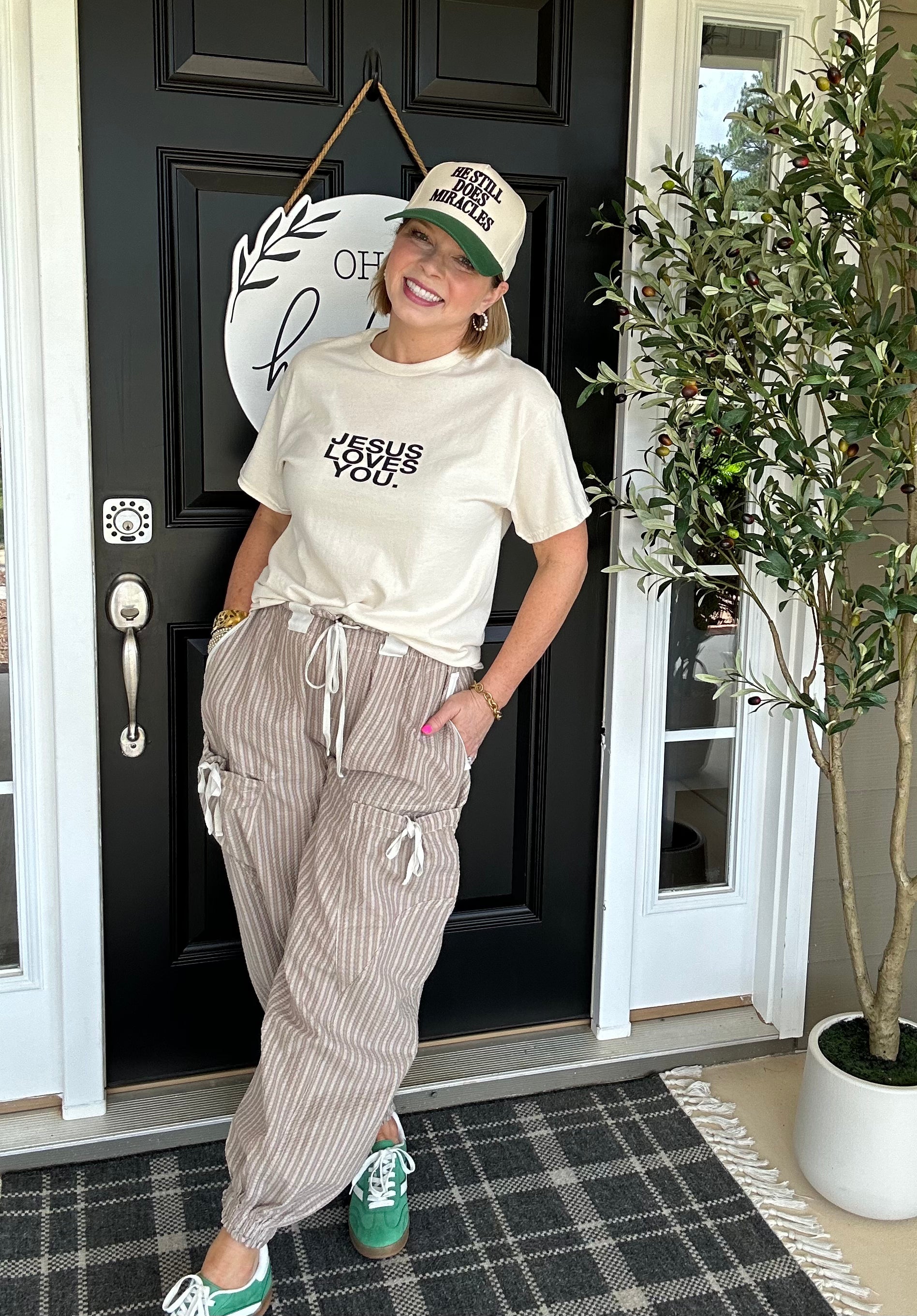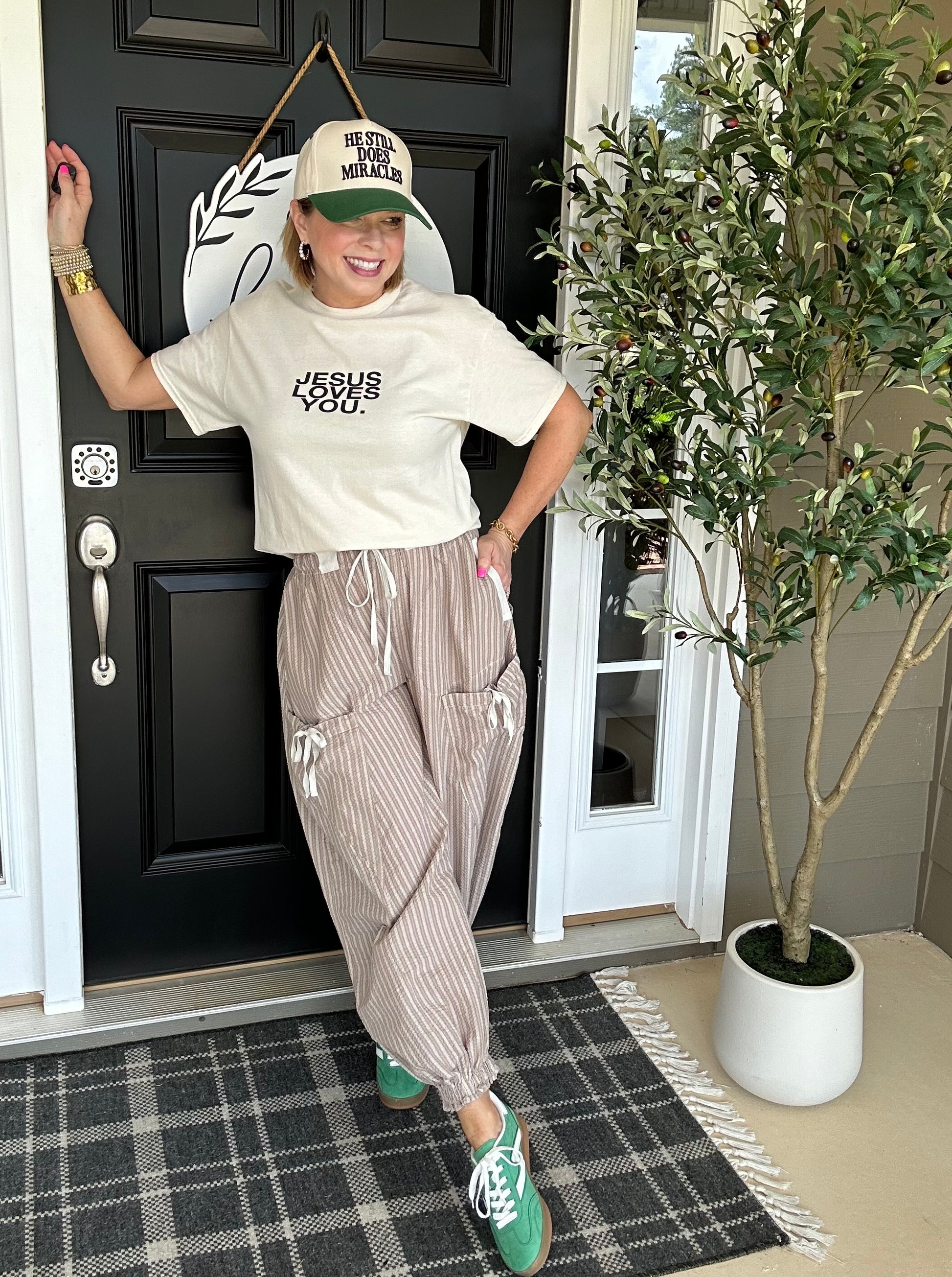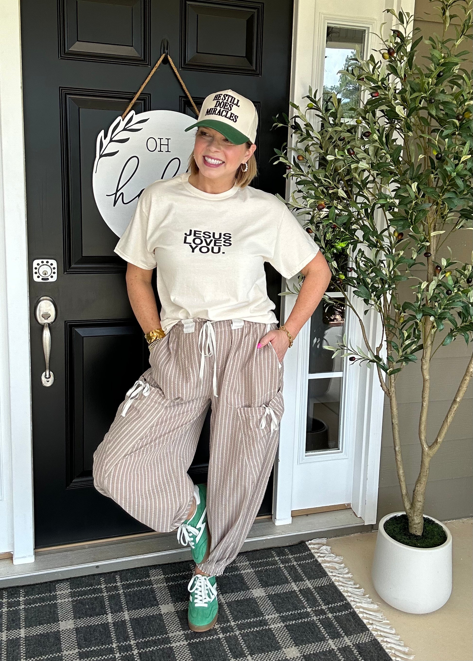 Striped Drawstring Side Pocket Statement Jogger Pant featuring a wide leg barrel look with an elastic waist and a drawstring cinch closure, two side hip pockets, two open side drawstring pockets, two back pockets, elastic cuffs creating a jogger pant leg and is a relaxed look.