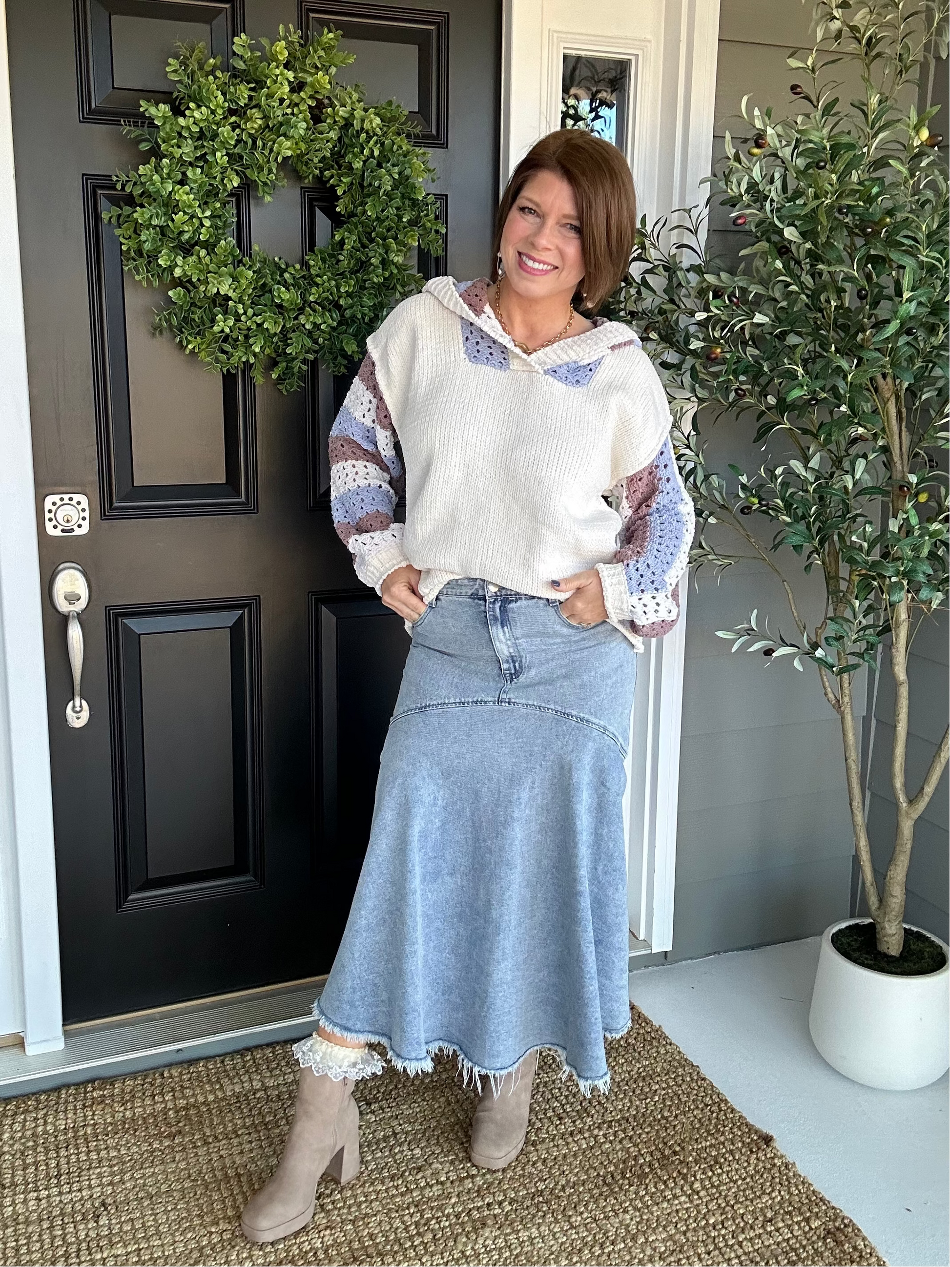 Discover the Camden Hooded Sweater—where style meets uncompromising comfort. This isn't just another sweater; it's an investment in versatility and quality. The eye-catching striped sleeves create visual interest that works with virtually any outfit, while intricate crochet detailing adds texture and dimension. The practical hood gives you styling flexibility for any occasion.