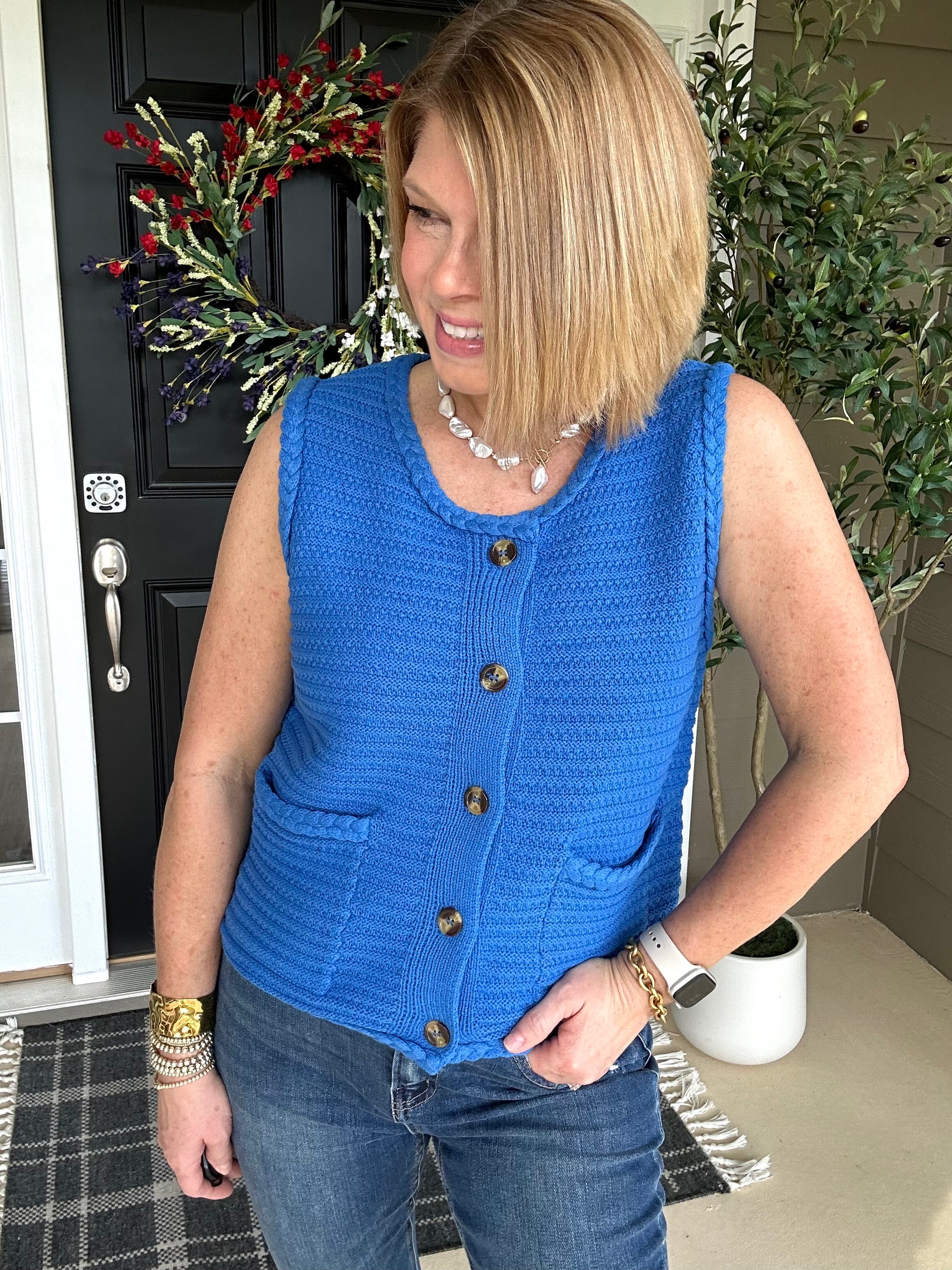 Women's solid knit sweater vest top featuring button front closure with pockets at front | braided detail around neckline, sleeves, and waist