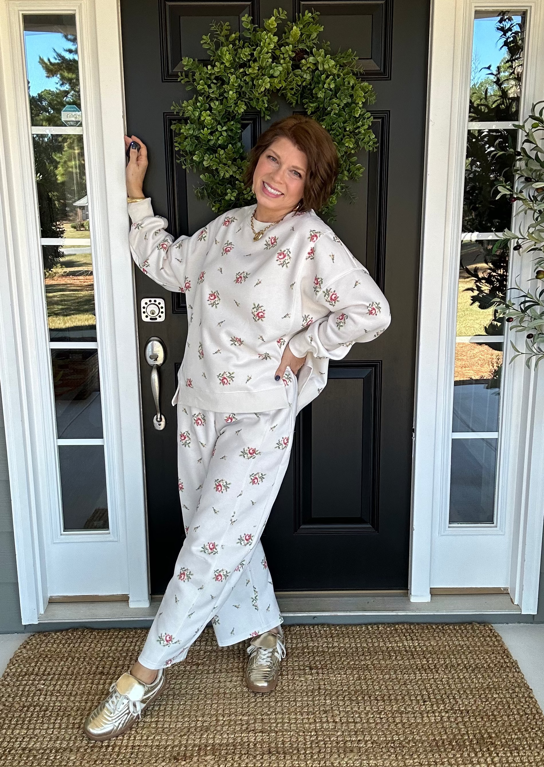 This coordinated two-piece ensemble features intricate floral embroidery detailing on premium fleece terry construction. The relaxed-fit sweatshirt pairs seamlessly with matching barrel-leg pants, creating a polished yet comfortable look. Crafted from soft fabric, this set delivers both style and everyday wearability for effortless sophistication.