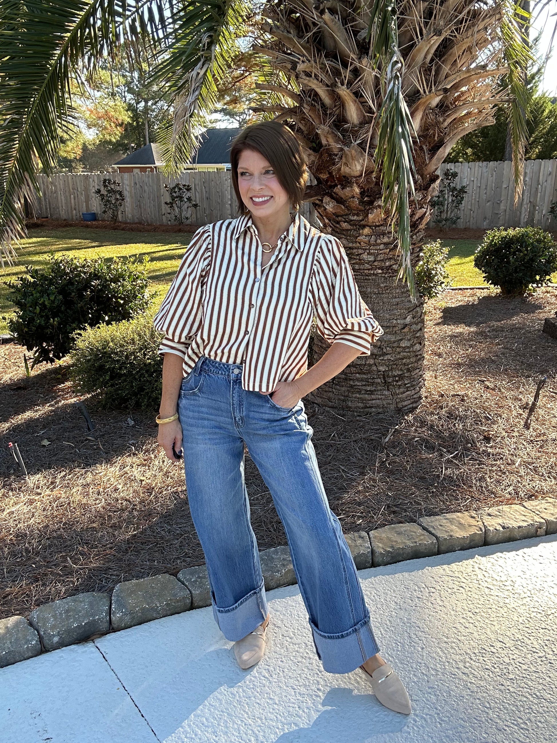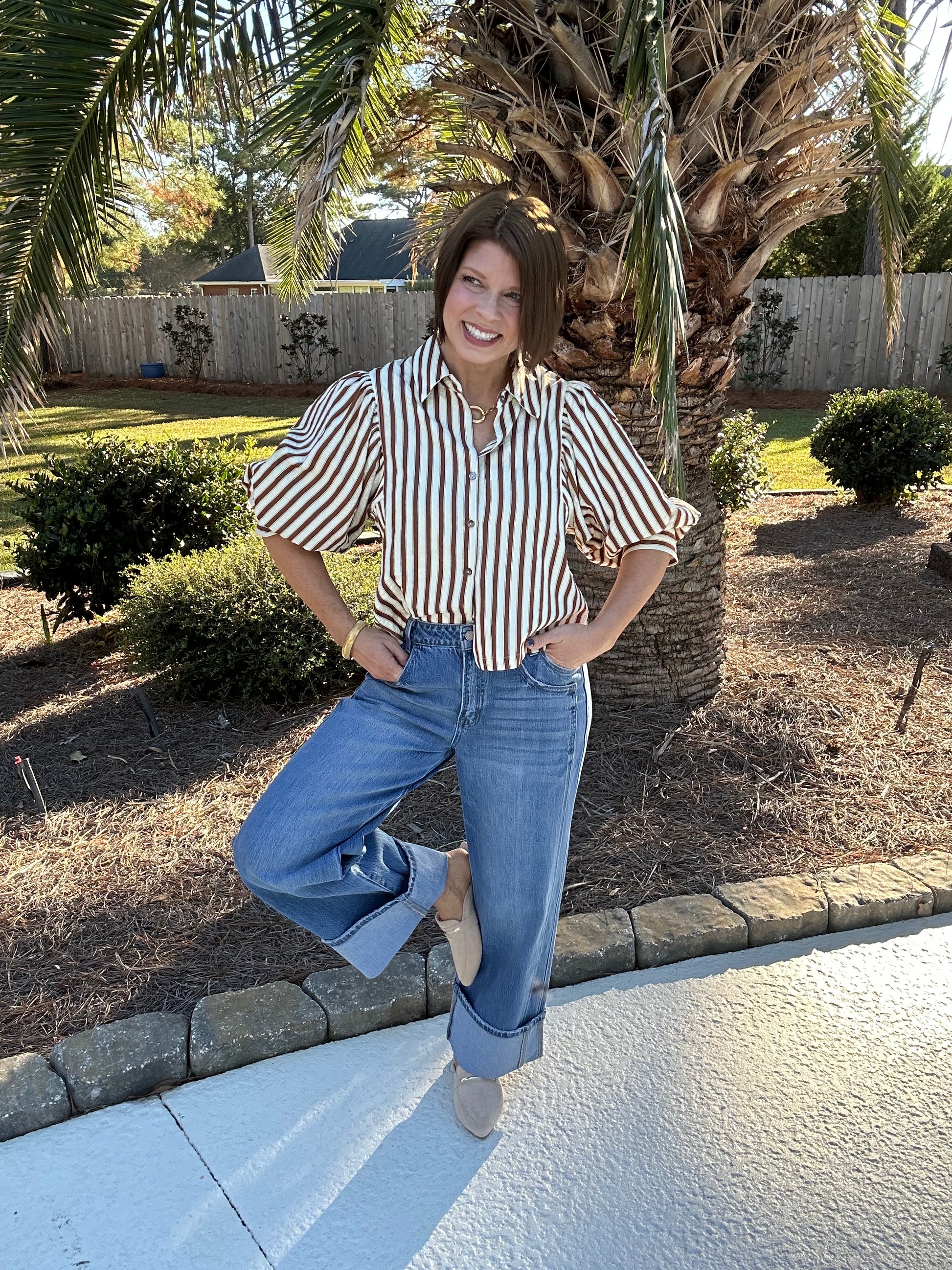 This versatile striped button-up delivers effortless style with its distinctive puff sleeves and three-quarter length cut. The medium silhouette provides comfortable, flattering coverage ideal for building a practical everyday wardrobe. A timeless piece that transitions seamlessly across seasons and occasions.