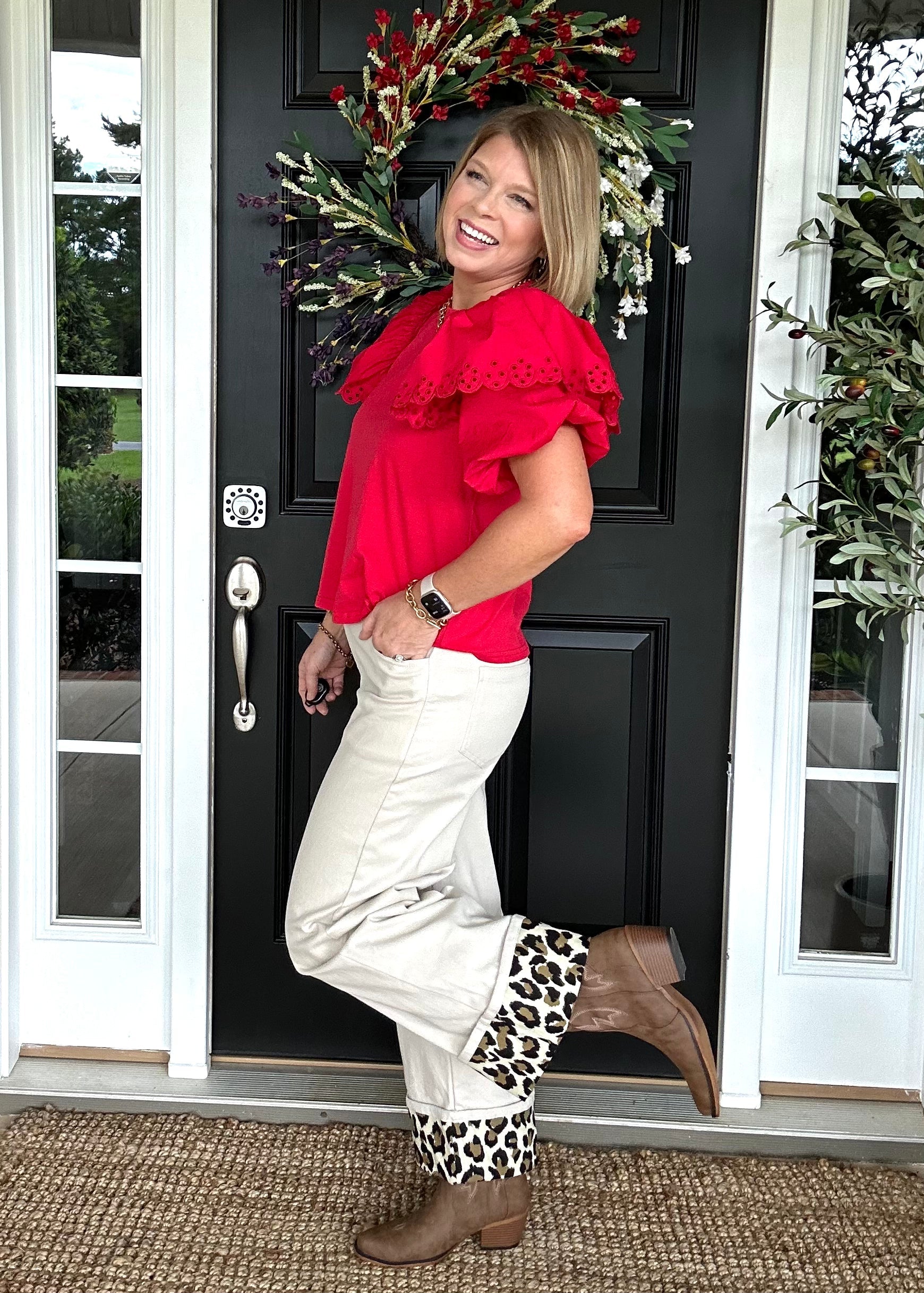 Experience bold sophistication with the Wild One Cuffed Pant. These solid high-waist, wide-leg pants feature a classic button fly-front with zipper closure for a secure, tailored fit. The striking contrast leopard cuff hem detail adds a distinct edge, blending timeless style with modern flair. Perfect for making a statement while maintaining comfort and confidence.Â
