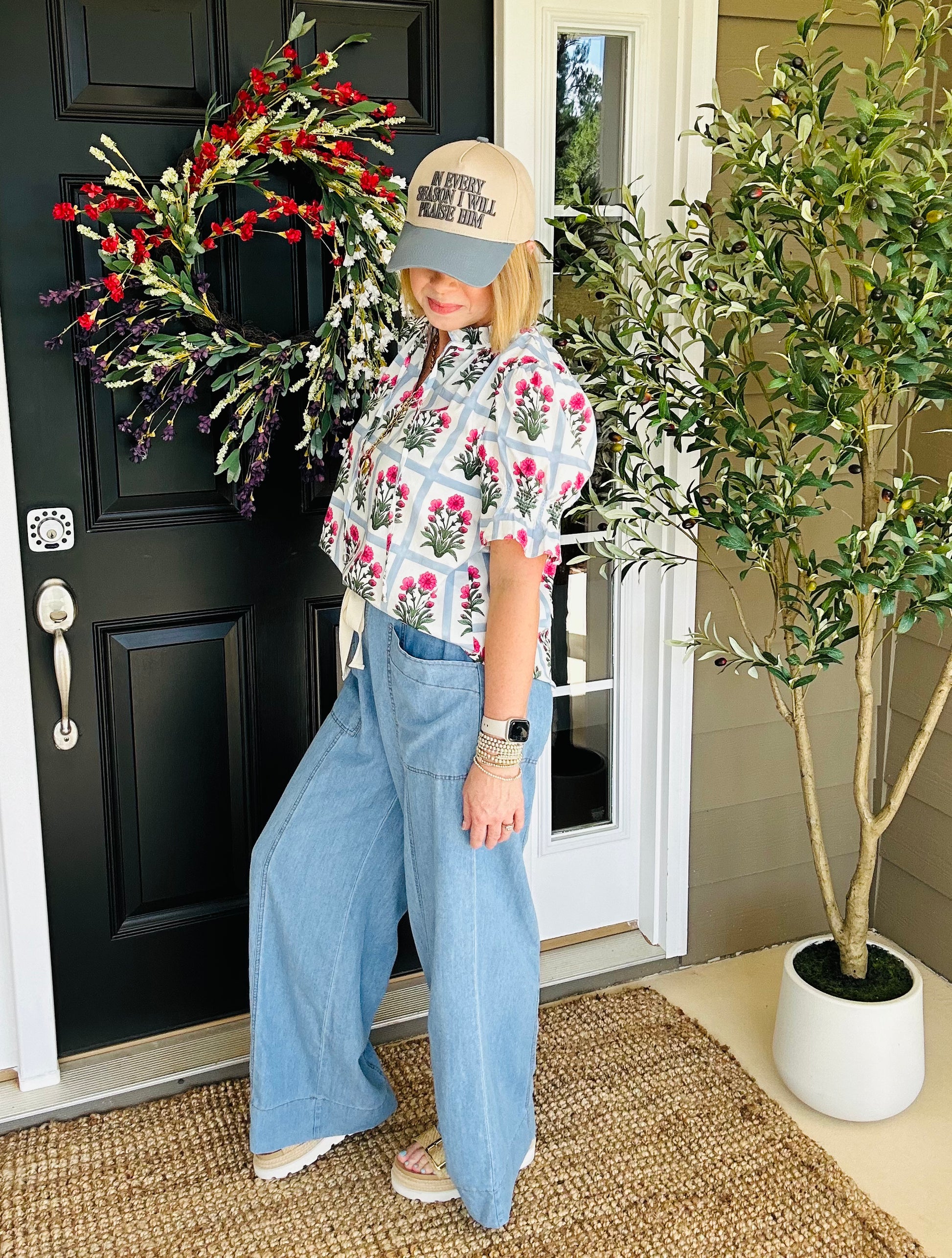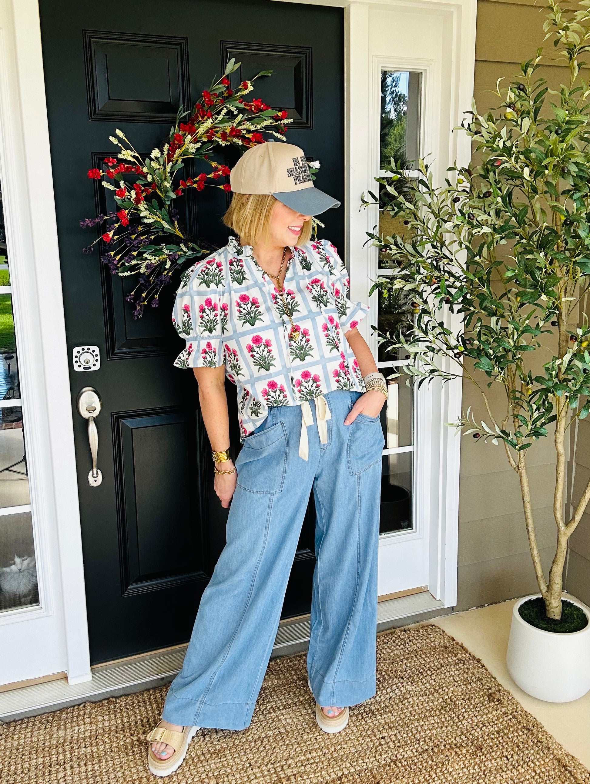 Floral pattern ruffle finish pullover top featuring outer smocked short sleeve. Unlined. Woven. Non-sheer. Lightweight.