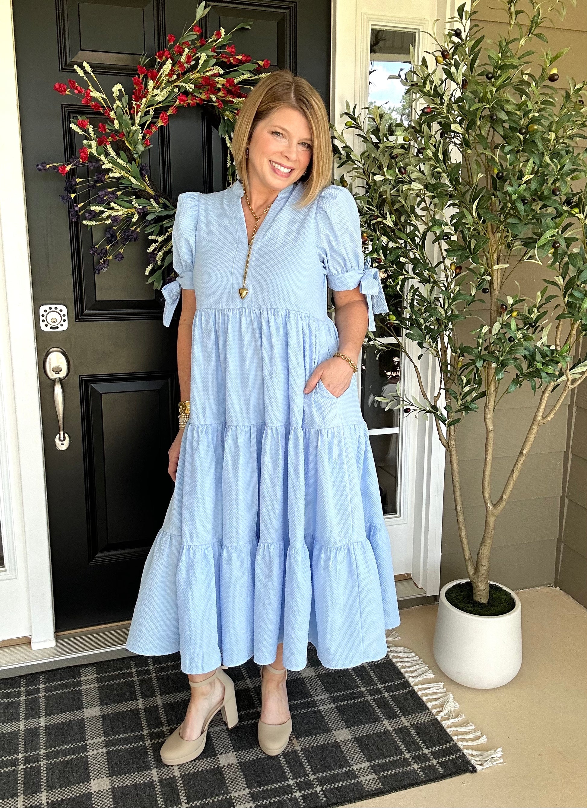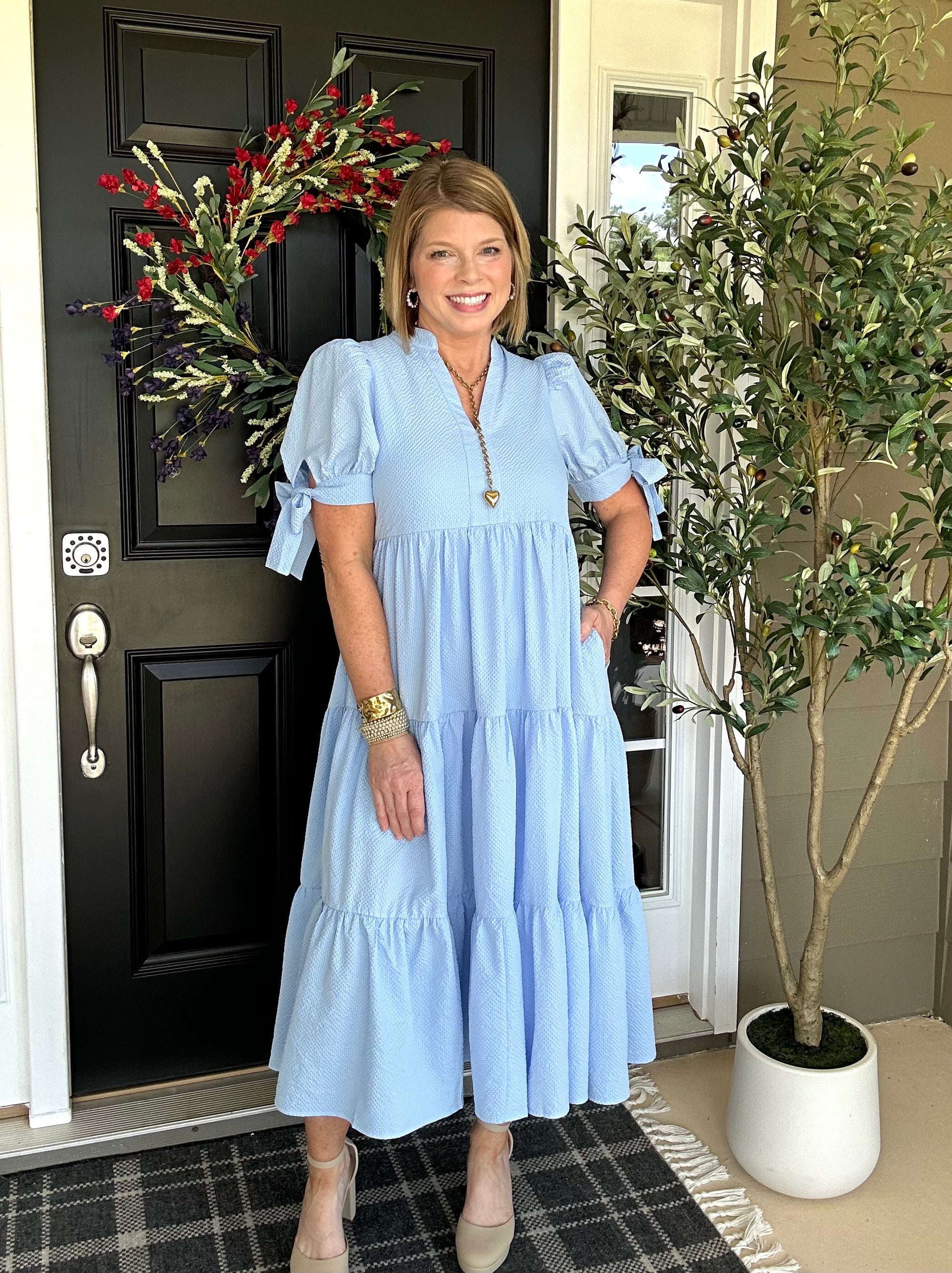 Women's solid textured tiered pullover midi dress featuring bow closure cuff short sleeves. Side pockets. Lined. Woven. Non-sheer. Lightweight.