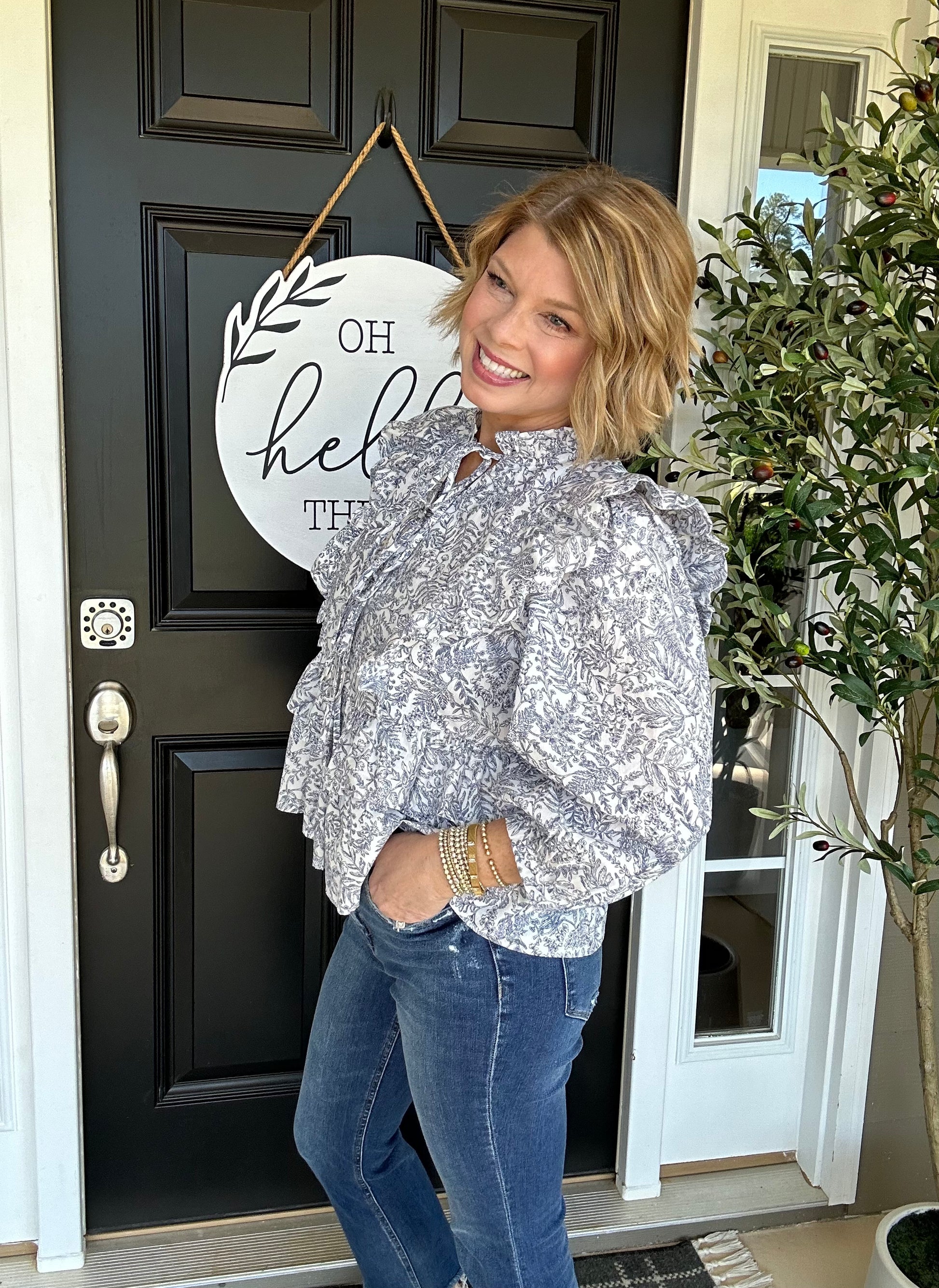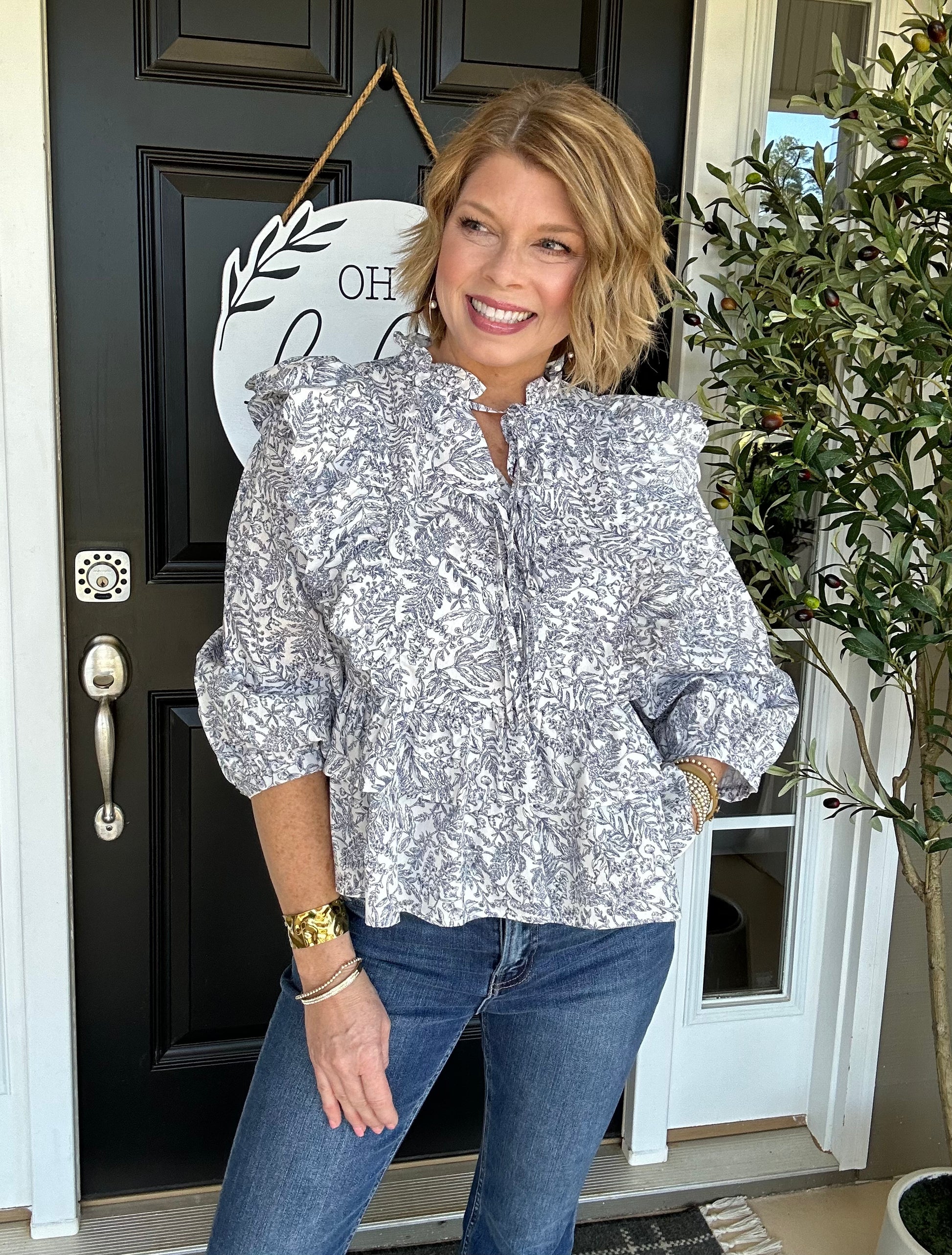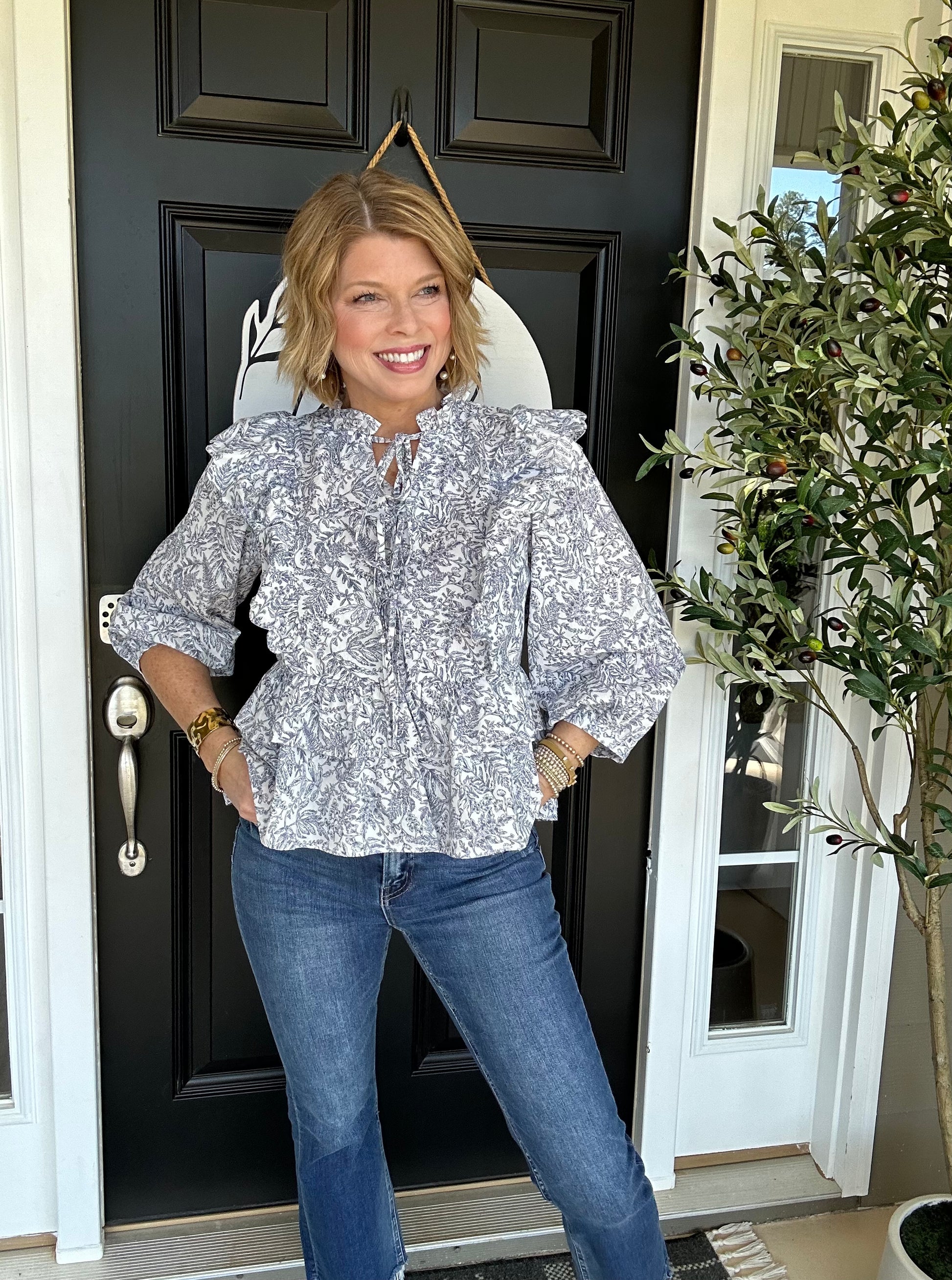 Women's botanical print relaxed fit peplum top featuring scallop finished ruffle details at front extending over shoulders | Button closure ¾ puff sleeves | Front ribbon tie closure | Unlined | Woven | Non-sheer | Lightweight.