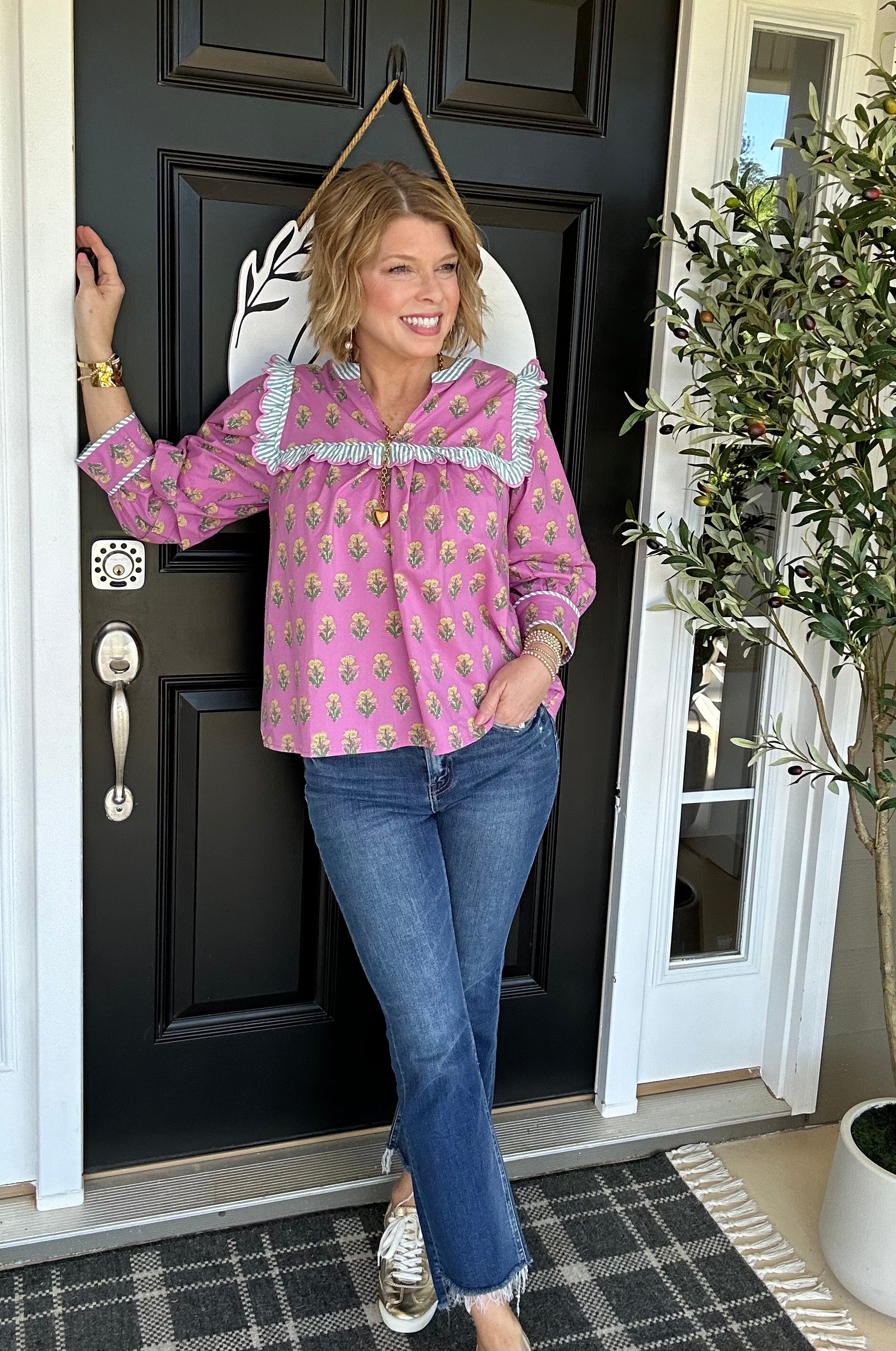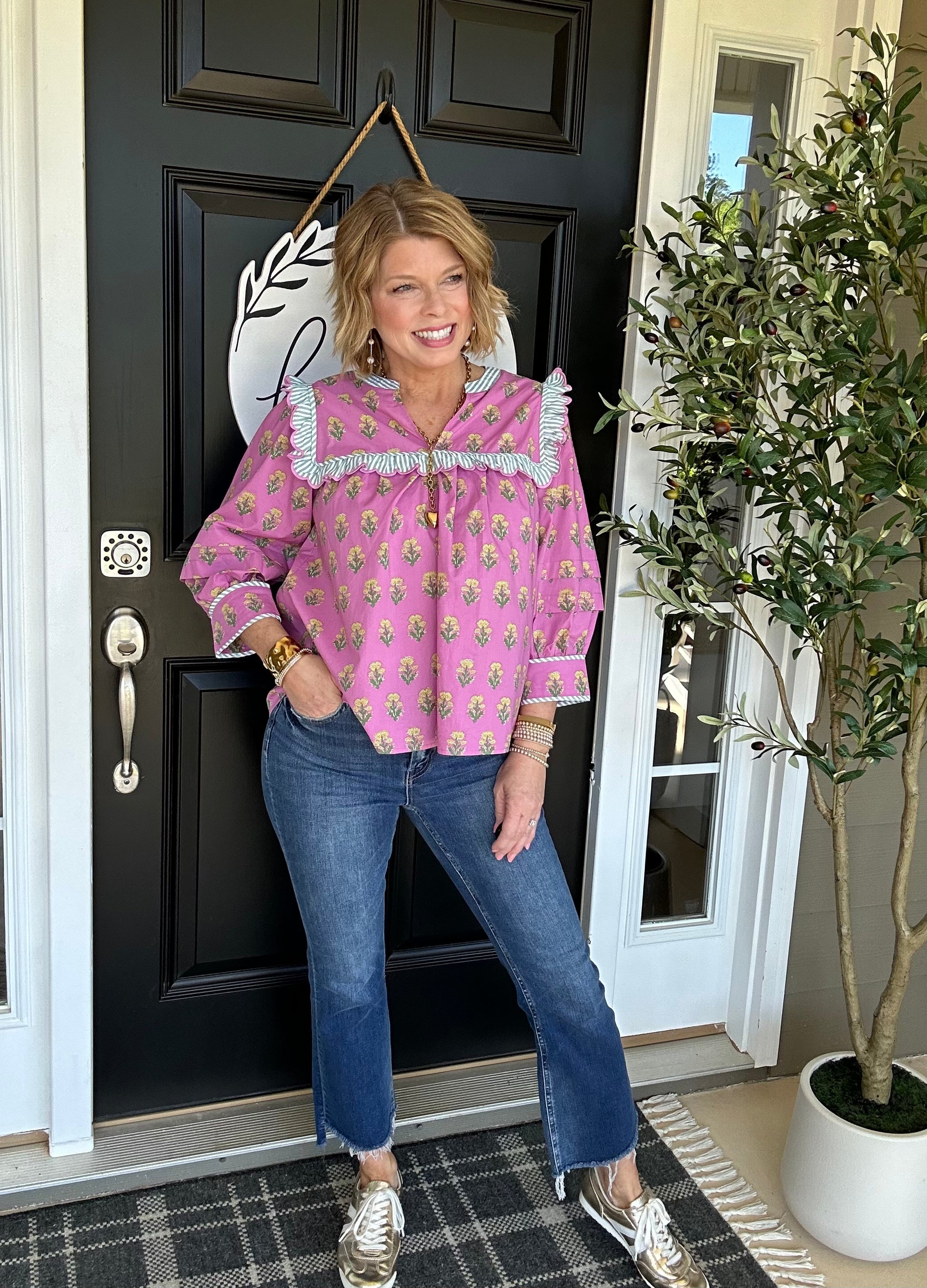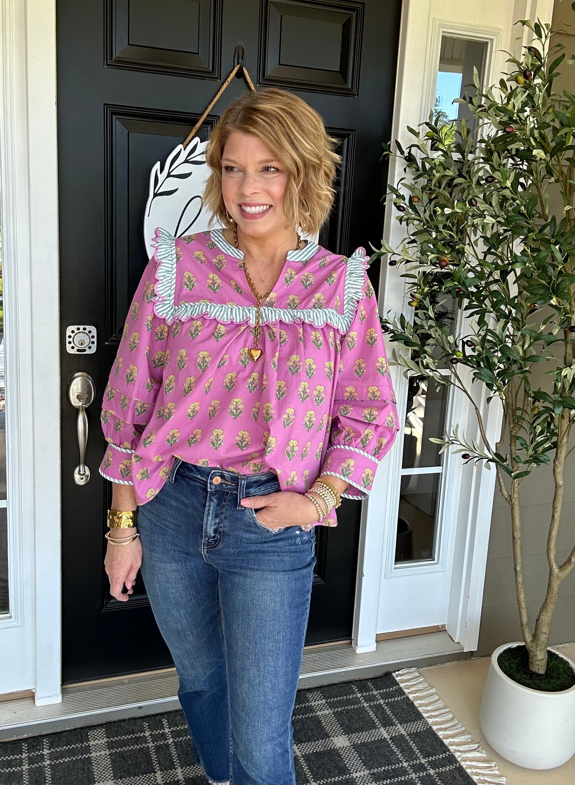 Printed ¾ puff sleeve pullover top featuring contrasting stripe finished with scallop finish along yoke front and back | Woven | Non-sheer | Lightweight.