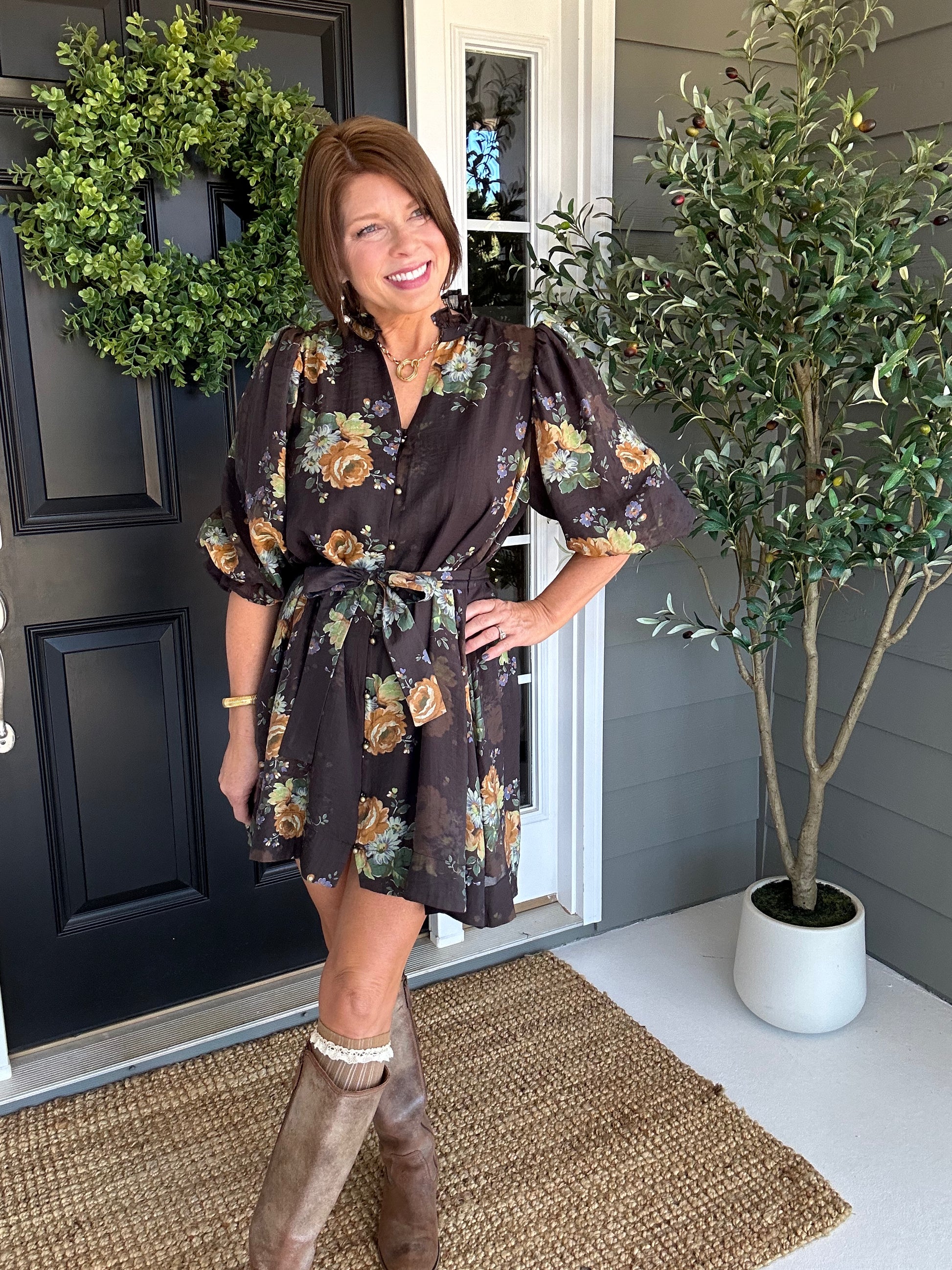 Floral print puff 3/4 sleeve mini dress featuring ruffled accent neck band collar V-neck. Button closure at front. Detachable waist tie. Lined. Woven. Non-sheer. Lightweight.