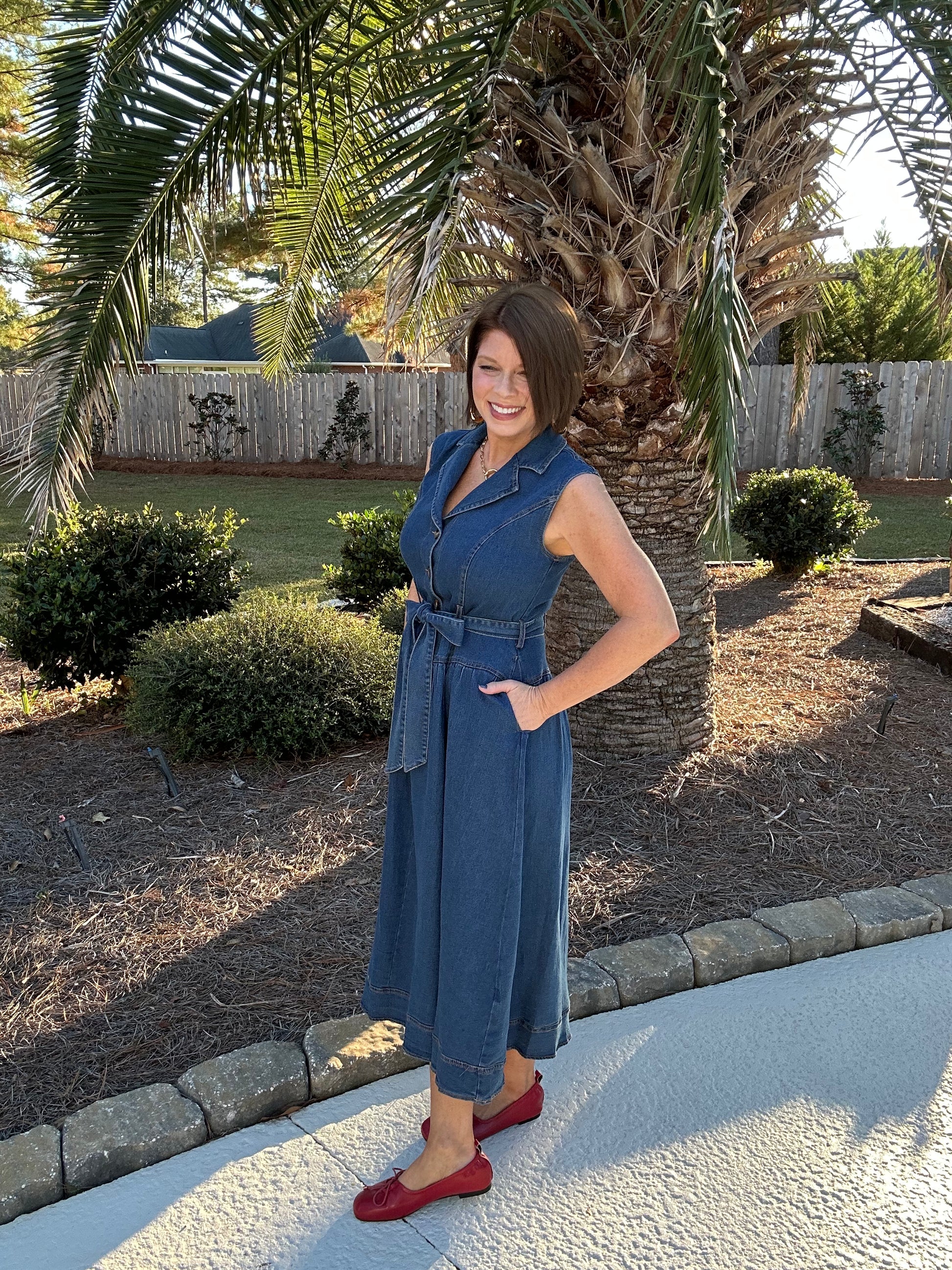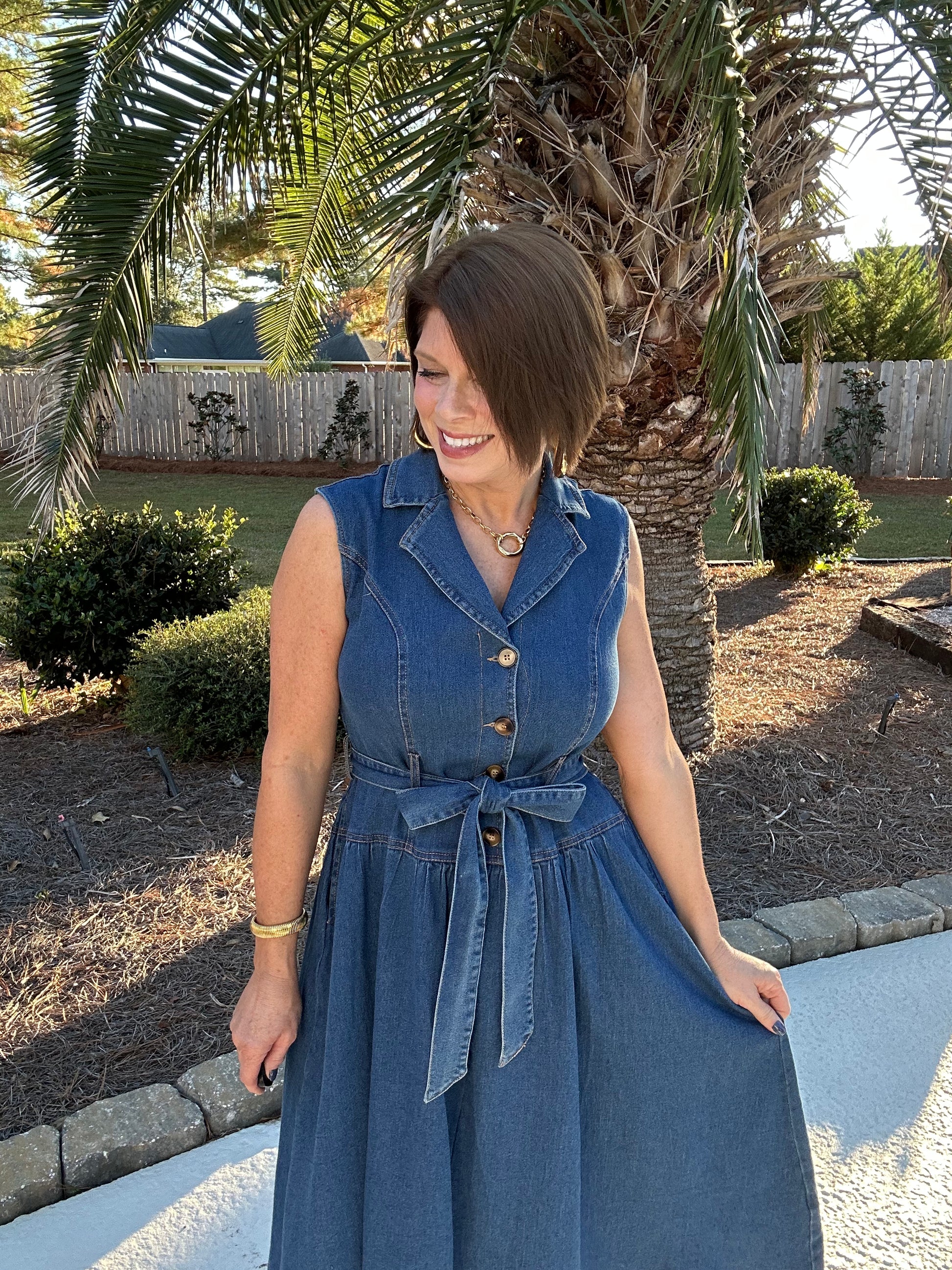 A modern update to a timeless style, this sleeveless denim midi dress features a notched collar, button-front closure, and subtle topstitch detailing. The self-tie belt offers a flattering fit, while side pockets add functionality. Finished with a gently flared skirt for graceful movement.